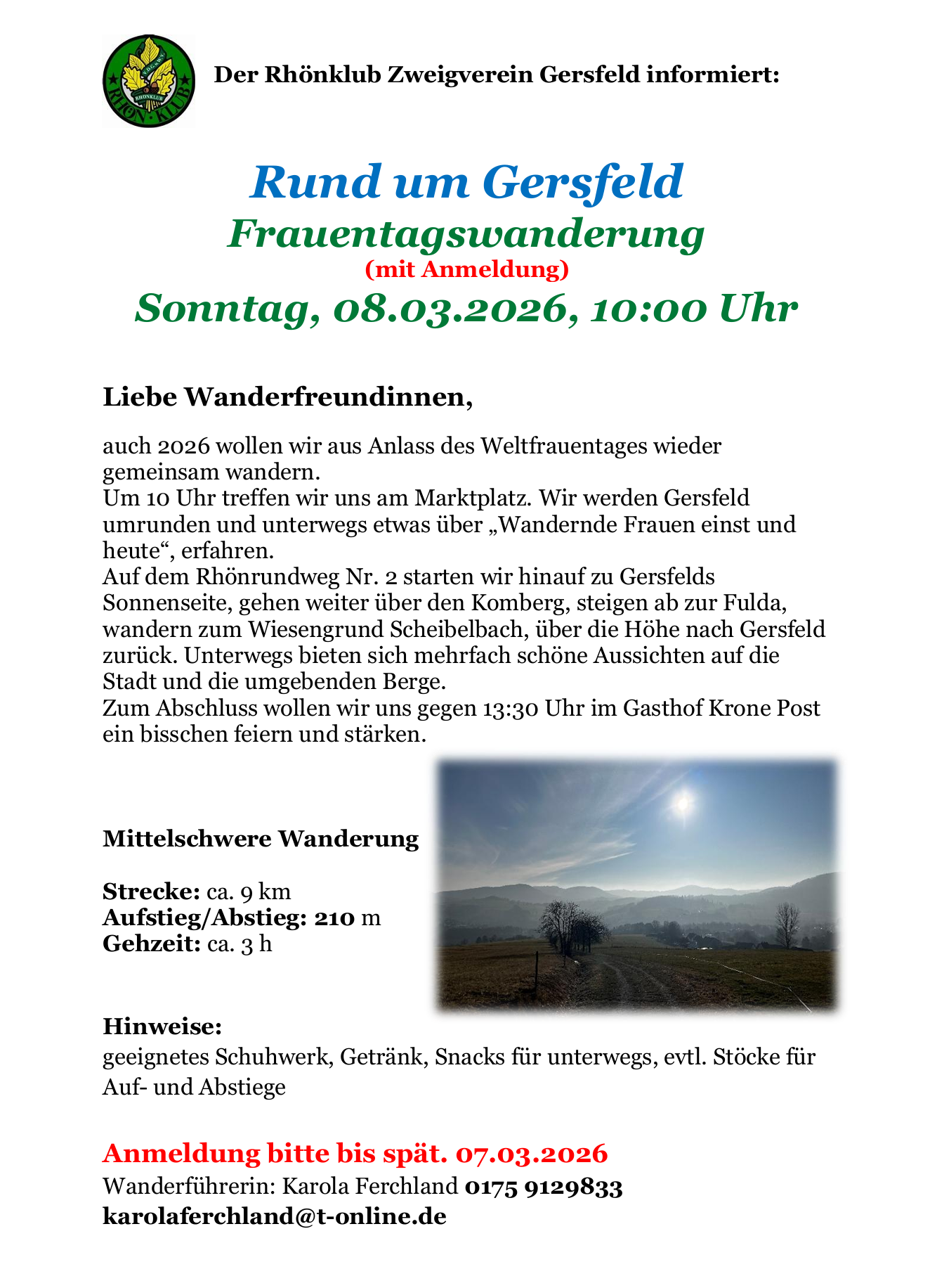 Die Vorsitzende gab zum Abschluss noch eine Übersicht über die geplante Jubiläumsveranstaltung des Rhönklubs im August 2026 und dankte den vielen ehrenamtlichen Helfern. Der Bürgermeister Dr. Steffen Korell sprach den Dank der Stadt Gersfeld an die Rhönklubmitglieder für ihre umfangreiche Unterstützung der touristischen Aktivitäten der Stadt Gersfeld aus und erklärte, dass die Stadt Gersfeld die Jubiläumsveranstaltung am 08.08/09.08.2026 tatkräftig unterstützen wird.