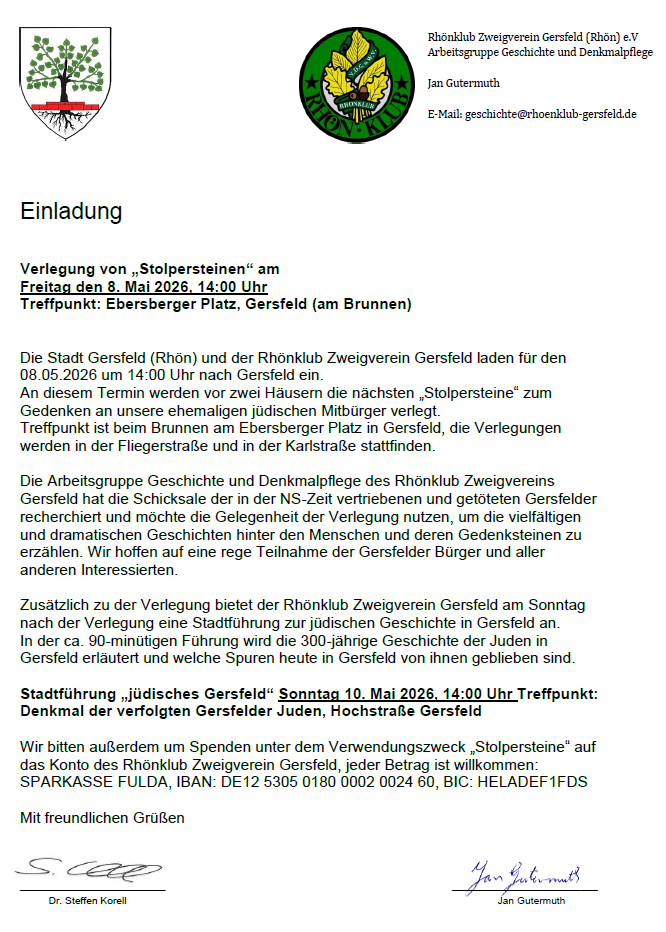 Spenden bitte unter dem Verwendungszweck „Stolpersteine“ auf das Konto des Rhönklub Zweigvereins Gersfeld bei der SPARKASSE FULDA, IBAN: DE12 5305 0180 0002 0024 60, BIC: HELADEF1FDS.