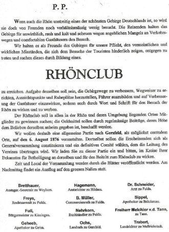 Die Gebirgswege zu verbessern, Wegweiser zu errichten, Aussichtpunkte und Ruheplätze herzustellen. Führer auszubilden und auf die Verbesserungen der Gasthäuser einzuwirken, sodann auch durch Wort und Schrift für den Besuch der Rhön zu wirken und zu werben, das der Schluss eines Aufrufes von 12 Rhönfreunden zu Bildung eines Vereines. Dieser Aufruf hatte Erfolg, am 6. August 1876 fand zu Gersfeld in Gasthof Zum Hirschen die Gründung des Rhönclubs mit 15 Sektionen statt.