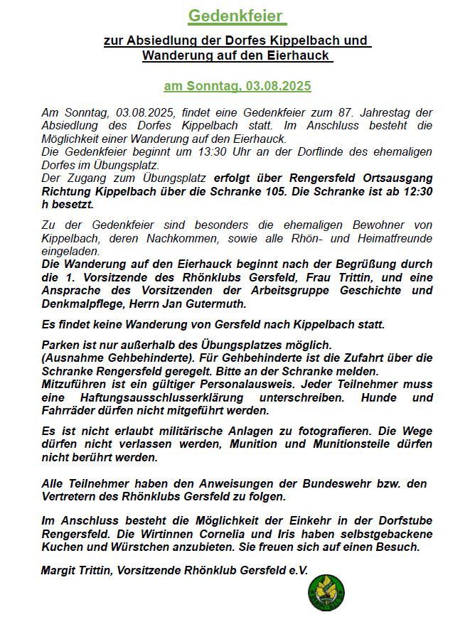 In diesem Jahr jährte sich die Absiedlung des Dorfes Kippelbach zum 87. Mal. Im Mai 1938 verließen die letzten Bewohner den Ort. Das Gelände des Dorfes wurde für den Truppenübungsplatz Wildflecken benötigt. Seit 1951 veranstaltet der Gersfelder Rhönklub Zweigverein regelmäßig eine Gedenkfeier.