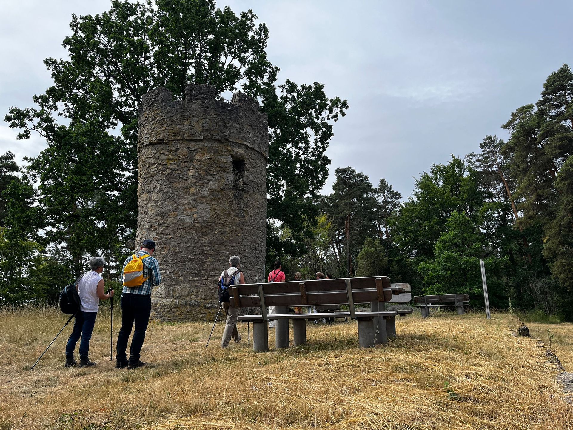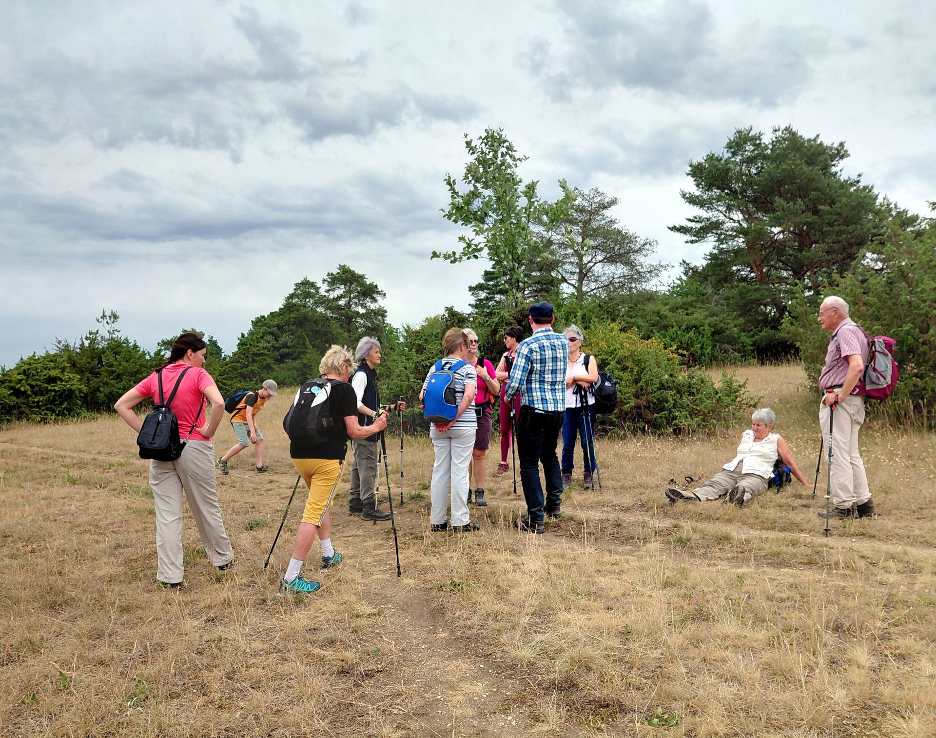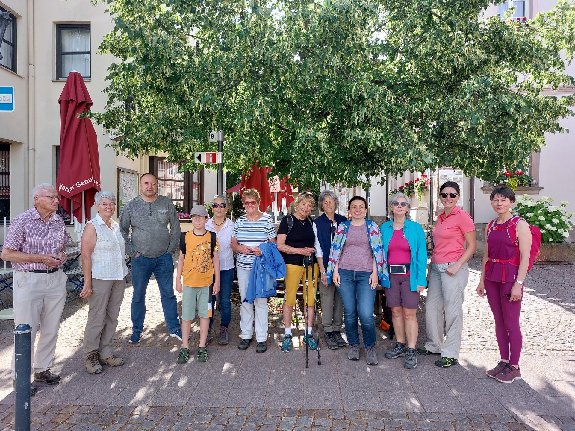 Am 6. Juli trafen sich 13 Wanderer am Marktplatz in Gersfeld und fuhren in Fahrgemeinschaften nach Münnerstadt. Bei angenehmen 20 Grad und bedecktem Himmel startete die Gruppe motiviert am Oberen Tor, am Rand der historischen Altstadt, die Wanderung. Bunte Gartenanlagen mit Poesie am Gartenzaun haben das Interesse geweckt. Entlang des Talwassers führte ein schattiger Weg in Richtung Hainberg. Die Rundwanderung verlief größtenteils auf Wiesenwegen und Waldpfaden durch die sanfte Hügellandschaft zwischen Rhön und Grabfeld. Auf dem Weg zum Heideplateau kamen die Teilnehmer gut gelaunt am historischen Wartturm Blauer Storch, an einer 300 Jahre alten Bildeiche, die seit 1987 Naturdenkmal ist und der Talkirche vorbei. Dort wurde eine Rast eingelegt. Wie geplant war die Gruppe gegen 14 Uhr wieder am Oberen Tor, das erstmals 1293 urkundlich erwähnt wurde und mit 36 Metern eines der höchsten Frankens ist. Von dort aus waren es nur wenige Schritte bis zum Marktplatz. In der Gaststätte zum Bären erwartete die angemeldete Gruppe um 14.10 Uhr bereits das Personal und bei leckerem Essen und Getränken klang der Wandertag langsam aus, bevor es gegen 16 Uhr mit den Autos zurück nach Gersfeld ging.