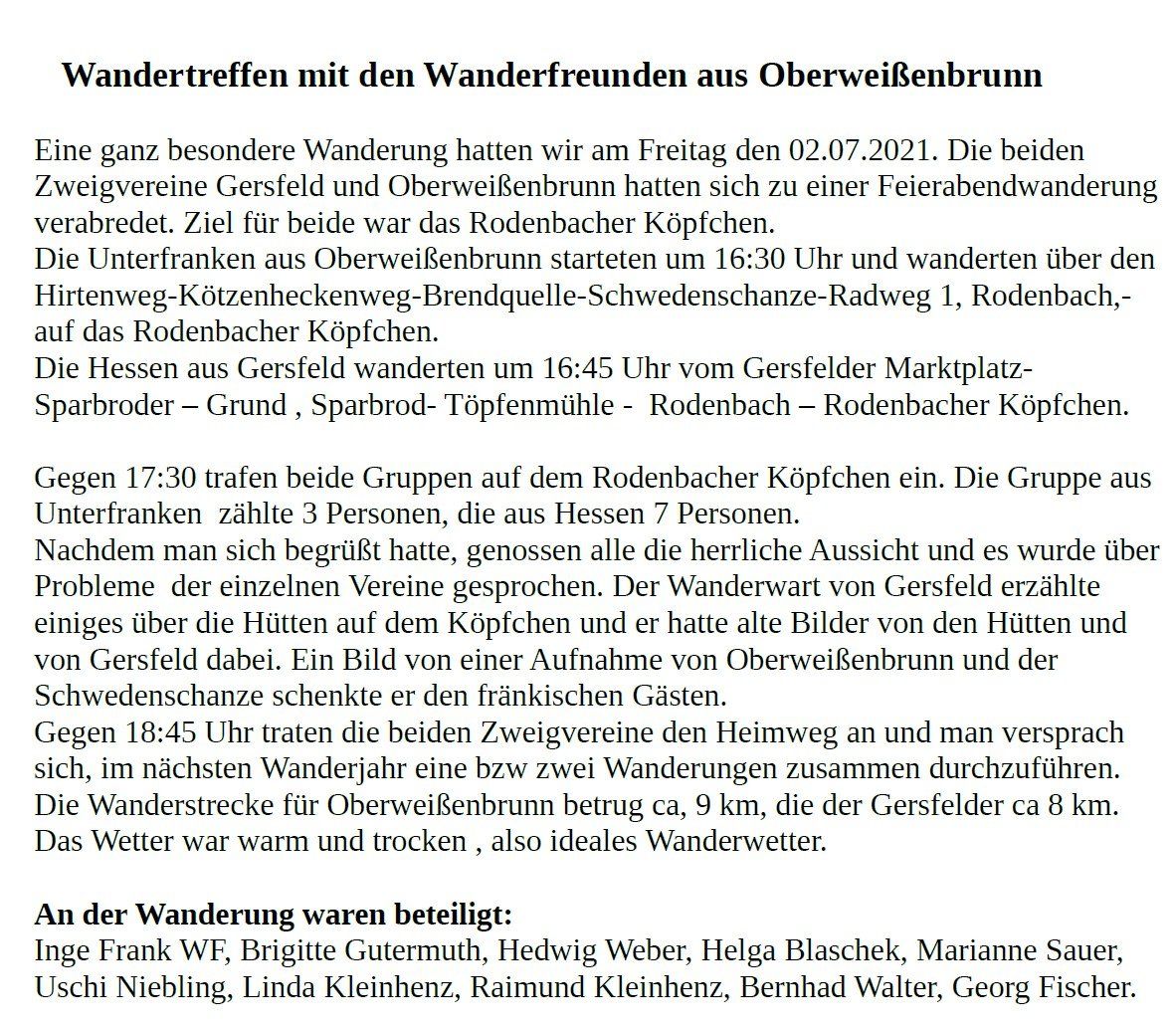 Wanderung zum Gottesdienst am Simmelsberg Bei herrlichem Sommerwetter trafen sich am Sonntag, den 31. August 2025 um 9.15 Uhr neun Wanderfreundinnen und -freunde am Gersfelder Marktplatz zu unserer Wanderung auf den Simmelsberg, wo in diesem Jahr der 30. Berggottesdienst stattfand. Am Rodenbacher Köpfchen vorbei führte uns der Weg bis zum Simmelsberg, wo wir um 11.00 Uhr am Gottesdienst teilnahmen. Danach traten wir den Heimweg an und machten in der Berghütte unsere verdiente Mittagsrast. Über Dammelhof ging es dann zurück nach Gersfeld, wo wir um 15.00 Uhr eintrafen. Teilnehmer: Renate Müller, Susi Maul, Vlada Niedling, Thomas Niedling, Ingrid Boll Mehler, Brigitte Romeis und 3 Wanderfreunde aus Bad Neustadt Wanderstrecke: 8 km Wanderführerinnen: Renate Müller und Susi Maul Bericht: Renate Müller Fotos: Susi Maul