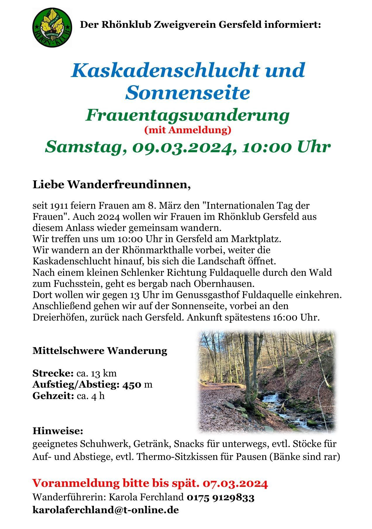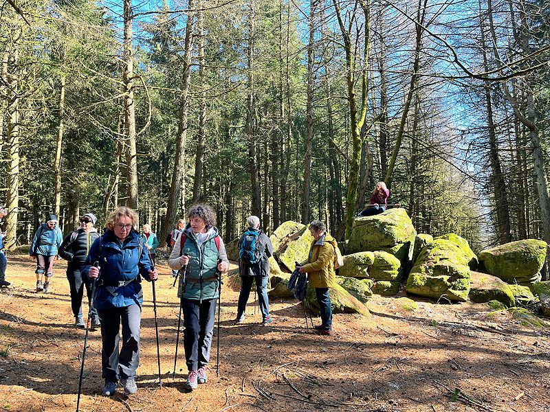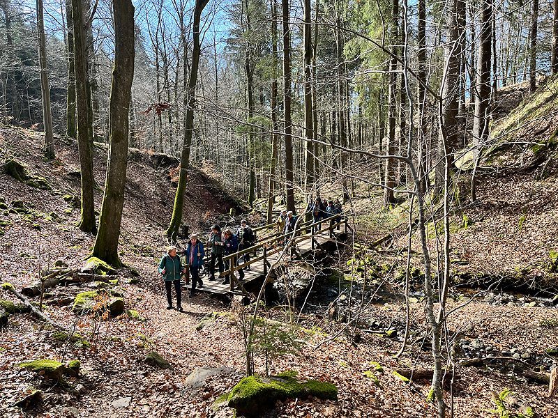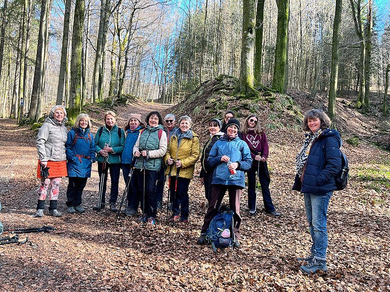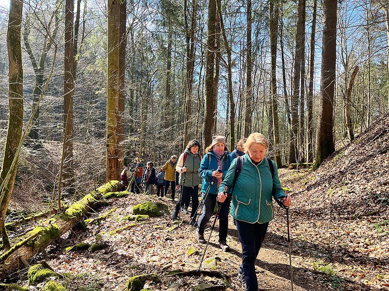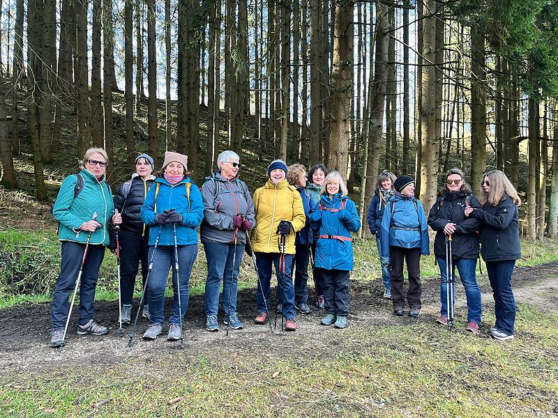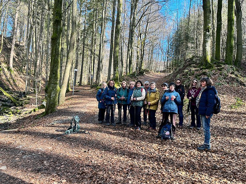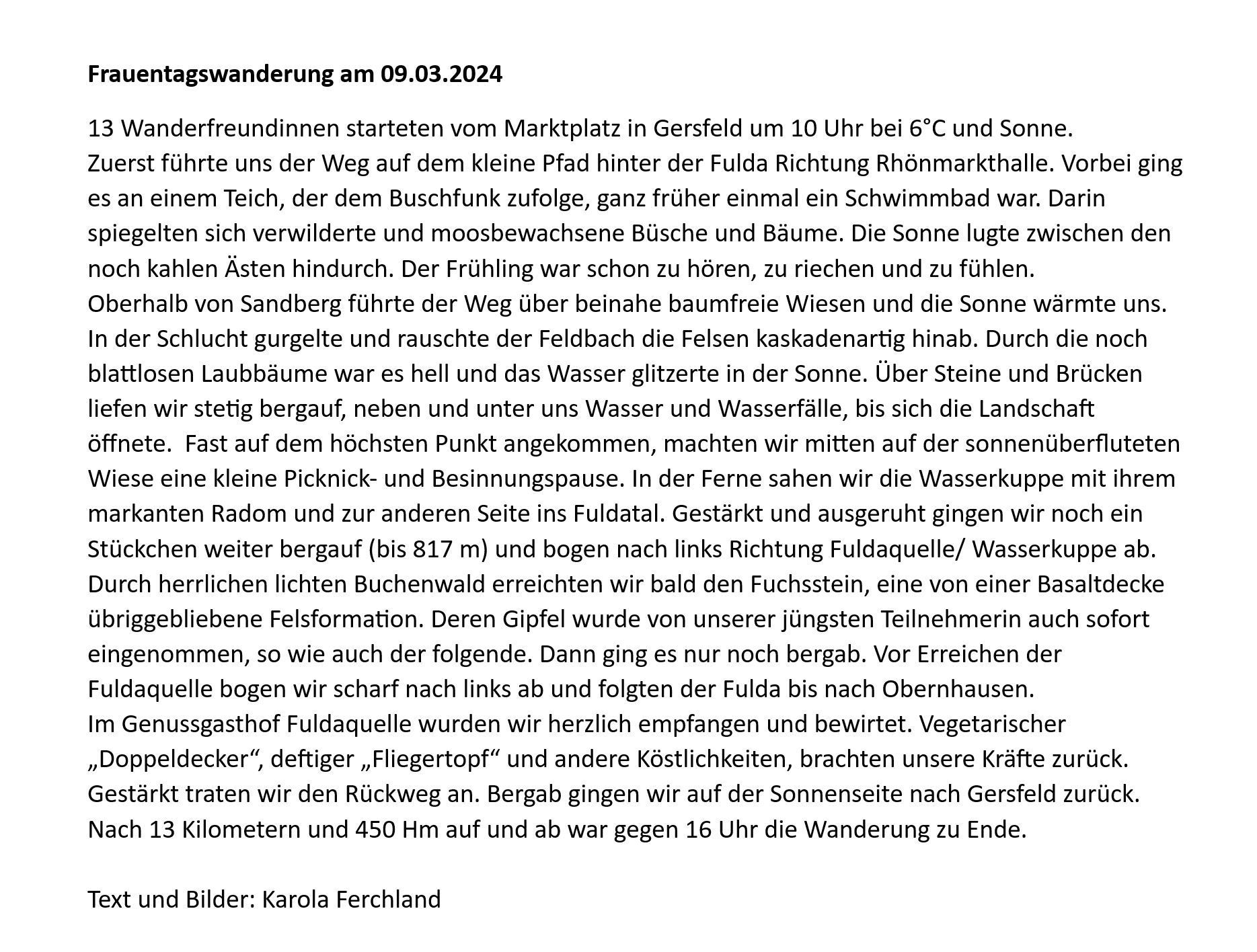 13 Wanderfreundinnen starteten vom Marktplatz in Gersfeld um 10 Uhr bei 6°C und Sonne. Zuerst führte uns der Weg auf dem kleine Pfad hinter der Fulda Richtung Rhönmarkthalle. Vorbei ging es an einem Teich, der dem Buschfunk zufolge, ganz früher einmal ein Schwimmbad war. Darin spiegelten sich verwilderte und moosbewachsene Büsche und Bäume. Die Sonne lugte zwischen den noch kahlen Ästen hindurch. Der Frühling war schon zu hören, zu riechen und zu fühlen.