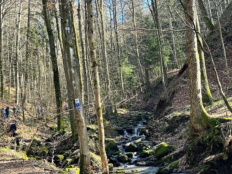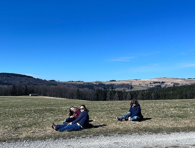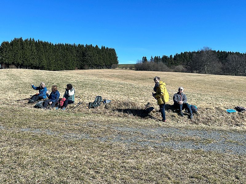 Oberhalb von Sandberg führte der Weg über beinahe baumfreie Wiesen und die Sonne wärmte uns. In der Schlucht gurgelte und rauschte der Feldbach die Felsen kaskadenartig hinab. Durch die noch blattlosen Laubbäume war es hell und das Wasser glitzerte in der Sonne. Über Steine und Brücken liefen wir stetig bergauf, neben und unter uns Wasser und Wasserfälle, bis sich die Landschaft öffnete. Fast auf dem höchsten Punkt angekommen, machten wir mitten auf der sonnenüberfluteten Wiese eine kleine Picknick- und Besinnungspause. In der Ferne sahen wir die Wasserkuppe mit ihrem markanten Radom und zur anderen Seite ins Fuldatal.
