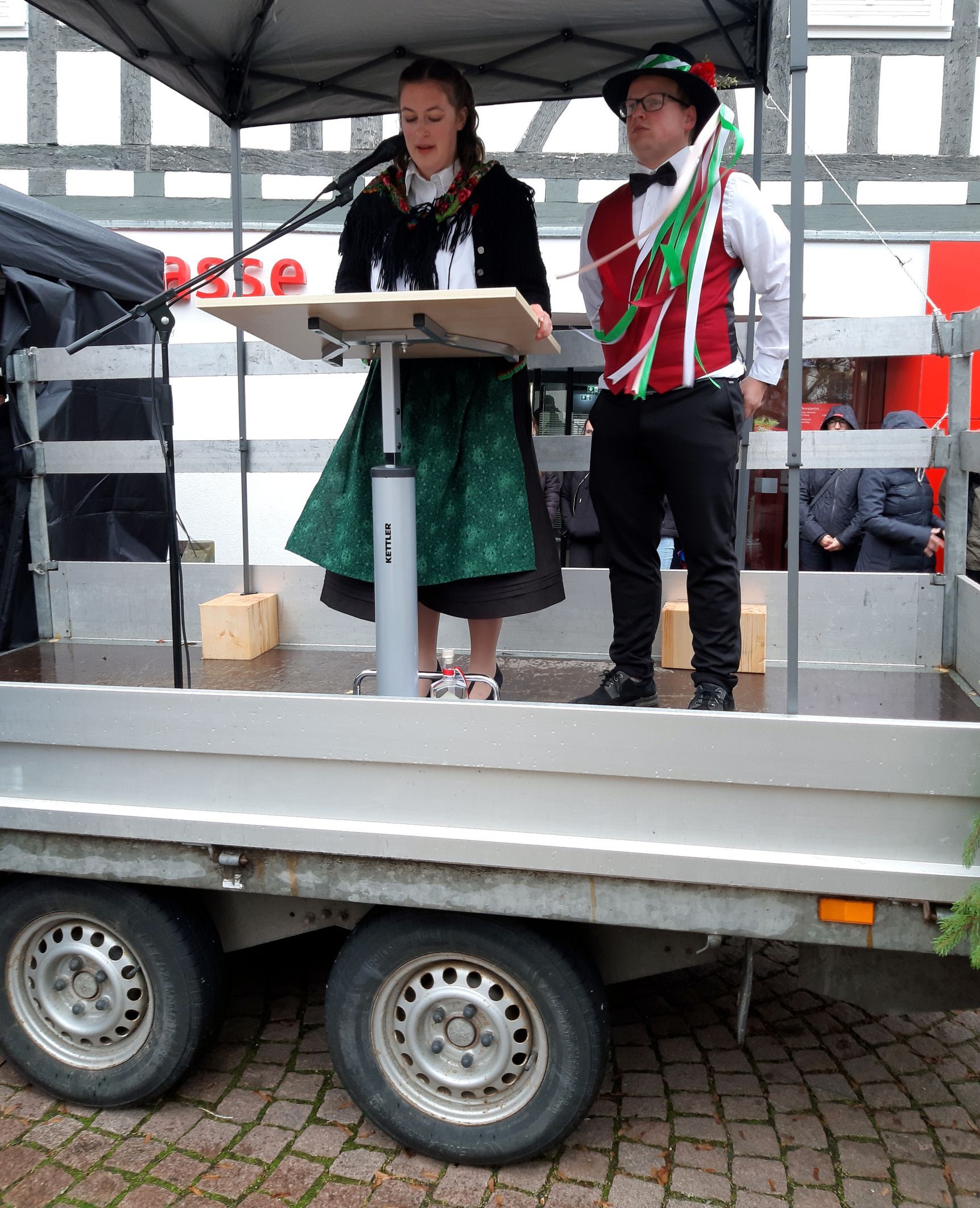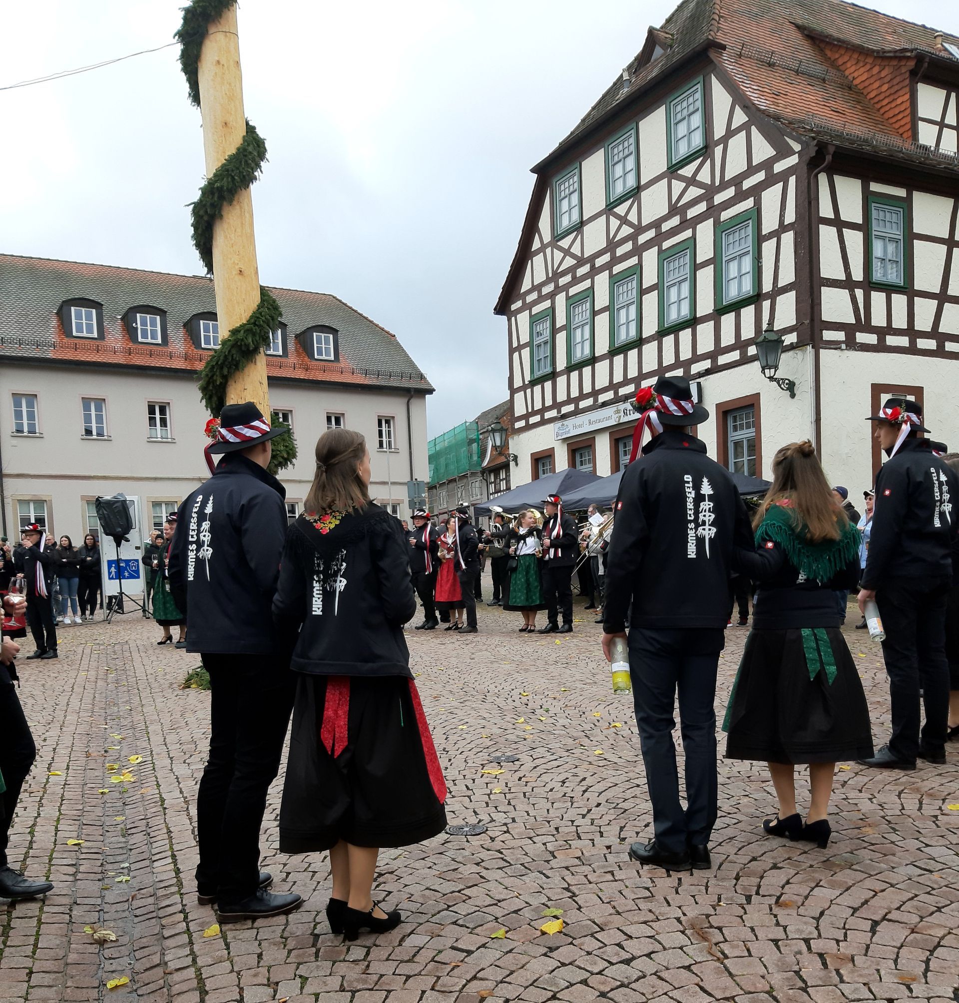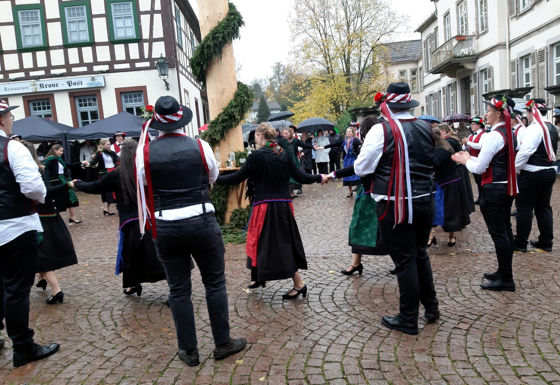 Der Sonntagmorgen begann mit dem Gottesdienst zur Kirchweih in der evangelischen Kirche. Danach liefen die 17 Tanzpaare mit musikalischer Begleitung der Stadtkapelle in Richtung Marktplatz. Dort reihten sie sich unter dem Kirmesbaum ein, welcher bereits am vorherigen Samstag aufgestellt wurde. Kaum begannen die Pärchen mit ihrem ersten Tanz, spielte leider das Wetter verrückt. Doch das hielt die Gruppe nicht auf. So wurden die Tänze schnell fertig getanzt und Reden und Pärchenvorstellungen konnten im Zelt weitergeführt werden. Anschließend verbrachten alle Anwesenden einen geselligen Nachmittag bei Kaffee und Kuchen oder einer Currywurst und einem Bier am Marktplatz.