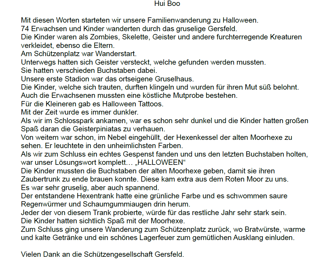 Hexenwanderung auf dem Hexenweg am 12.10.2025 Am 12. Oktober 2025 trafen wir uns um 10.00 Uhr am Gersfelder Marktplatz zu unserer diesjährigen Herbstwanderung auf dem Hexenweg bei Fischbach (Rhön). 15 Wanderer waren gekommen und in Fahrgemeinschaften fuhren wir nach Fischbach in Thüringen. Bei herrlichem Herbstwetter ging´s auf den Hexenweg. Durch wunderschöne buntgefärbte Buchenwälder wanderten wir zunächst bis zum Hexentanzplatz. Hier gab´s erstmal einen Hexentrank und dann führte uns der Weg auf schönen Wiesenwegen zurück nach Fischbach. Am Parkplatz angekommen konnten wir uns noch eine mobile Apfelpresse anschauen bevor wir weiterfuhren zum "Thüringer Rhönhaus". Nach einer verdienten Stärkung mit Kaffee, Kuchen und Deftigem ging´s dann zurück nach Gersfeld. Wanderstrecke : 6 km Wanderführerin : Renate Müller Text: Renate Müller Fotos: Susi Maul, Thomas Niedling