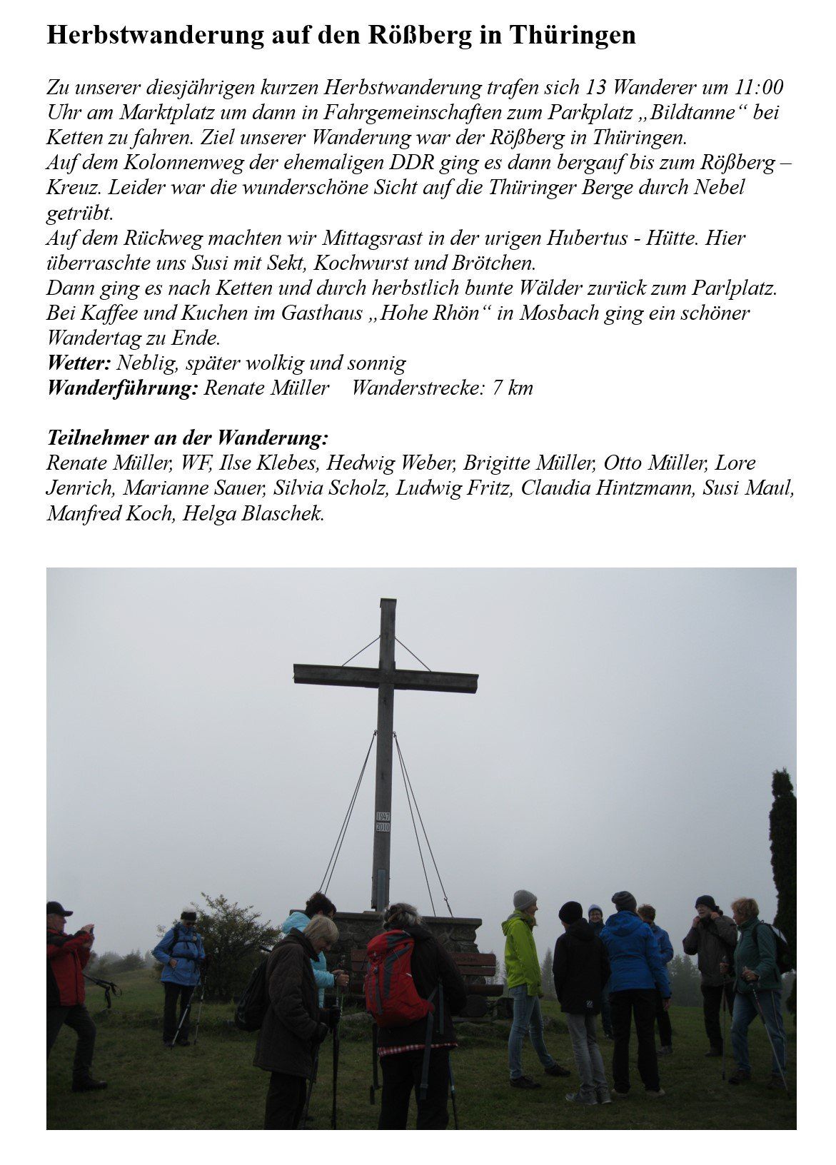 Hexenwanderung auf dem Hexenweg am 12.10.2025 Am 12. Oktober 2025 trafen wir uns um 10.00 Uhr am Gersfelder Marktplatz zu unserer diesjährigen Herbstwanderung auf dem Hexenweg bei Fischbach (Rhön). 15 Wanderer waren gekommen und in Fahrgemeinschaften fuhren wir nach Fischbach in Thüringen. Bei herrlichem Herbstwetter ging´s auf den Hexenweg. Durch wunderschöne buntgefärbte Buchenwälder wanderten wir zunächst bis zum Hexentanzplatz. Hier gab´s erstmal einen Hexentrank und dann führte uns der Weg auf schönen Wiesenwegen zurück nach Fischbach. Am Parkplatz angekommen konnten wir uns noch eine mobile Apfelpresse anschauen bevor wir weiterfuhren zum "Thüringer Rhönhaus". Nach einer verdienten Stärkung mit Kaffee, Kuchen und Deftigem ging´s dann zurück nach Gersfeld. Wanderstrecke : 6 km Wanderführerin : Renate Müller Text: Renate Müller Fotos: Susi Maul, Thomas Niedling
