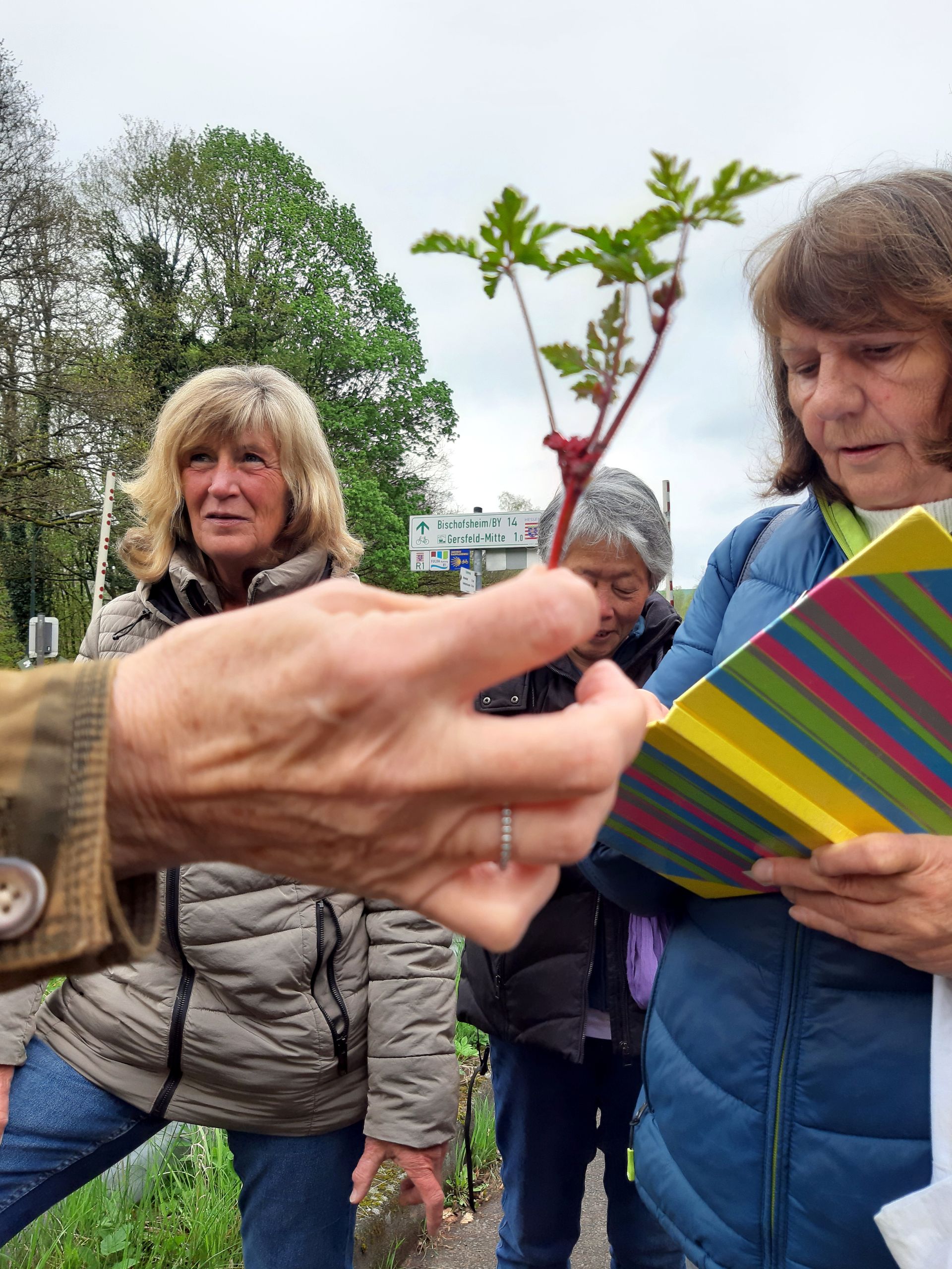 Wir trafen uns mit Gabi Krenzer, der Kräuterexpertin aus Gersfeld, um 16.00 Uhr vor der Tourist-Information. Von hier aus ging es über die Wiesenstraße an den Radweg R 1 Richtung Bahnübergang. Gabi fand gleich Kräuter, die sie uns erläuterte. So war der Bachnelkenwurz die erste Pflanze, deren Verwendung sie uns erläuterte. Es folgten viele Pflanzen, deren Wirkstoffe sowohl als Heilkraut als auch für die Küche erläutert wurden. Weißdorn, Spitzwegerich, Schlangenknöterich, Brennnessel, Sauerampfer, Löwenzahn, kriechender Günzel, Gundermann, Knoblauchrauke, Mädesüß und viele Pflanzen mehr wurden gesammelt und fleißig notiert, wofür man sie einsetzen kann. Insgesamt 10 Personen lauschten Frau Krenzers Ausführungen. Die Zeit verflog im Nu. Nach 2 Stunden waren wir an unserem Ausgangspunkt zurück.