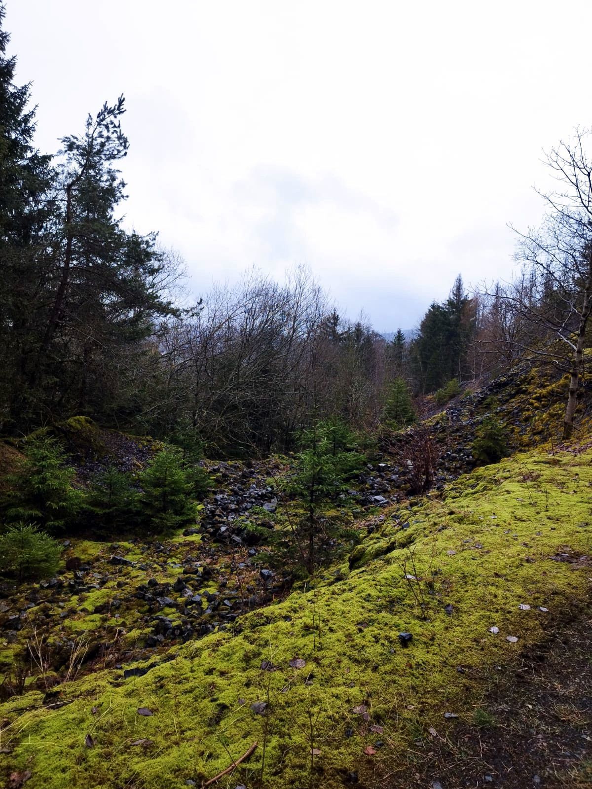 Der nicht nachlassende Regen sowie die Vorschädigung der Waldwege durch die Holzabfuhr sorgten auf dem Abstieg ins Gichenbachtal an vielen Stellen für matschige Schuhe. Kaum war der ein oder andere sehr feuchte Wegeabschnitt überwunden, kam nach der folgenden Kurve schon die nächste Schlammpartie zum Vorschein. Zwischenzeitlich war ein weiterer Wanderer zur Gruppe hinzugestoßen, der von der anderen Seite kam und einen PKW für die Verkürzung auf die halbe Strecke dabei hatte. Der Regen nahm mal zu, mal ab. Umso größer war die Freude der Wanderer unter ihrem Regenschirm, als nach knapp drei Stunden die Haderwaldhütte in Sichtweite kam.
