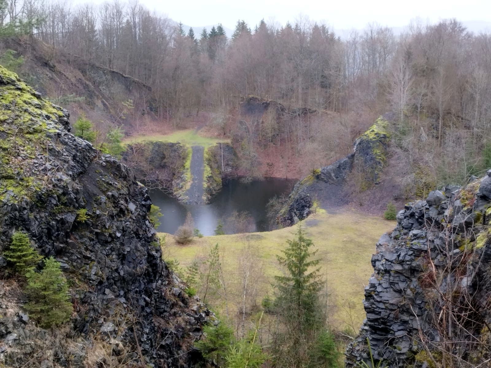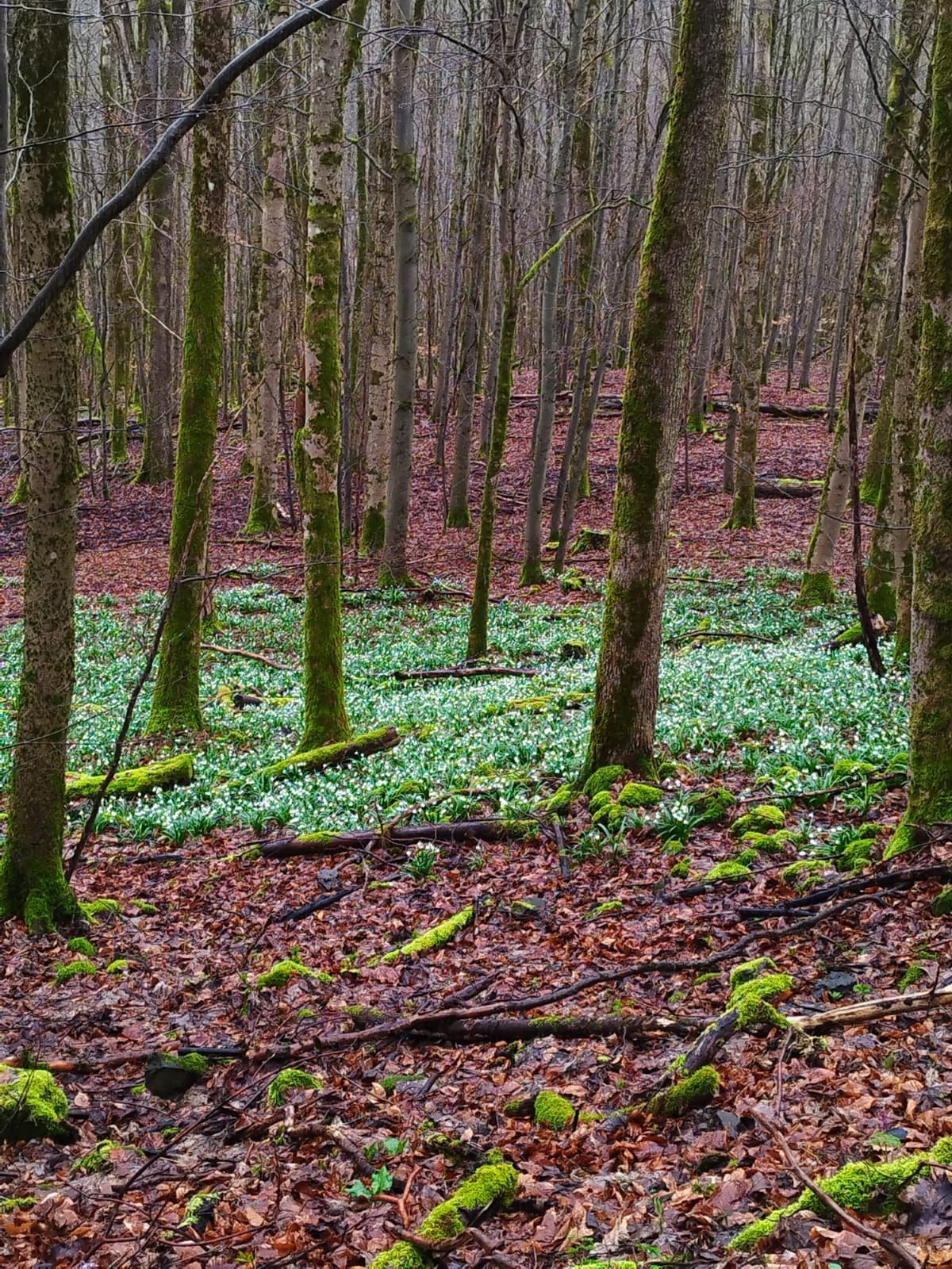 Auf der Nalle angekommen reichte die Aussicht immerhin bis zur ganz oben im Nebel versunkenen Wasserkuppe. Pünktlich zum Start der Wanderung hatte Nieselregen eingesetzt. Dieser wurde gegen Mittag stärker, was die Gruppe jedoch nicht davon abhielt die wunderbaren Märzenbecherfelder im Wald ausgiebig zu bestaunen, nachdem man den Basaltsee besichtigt hatte.