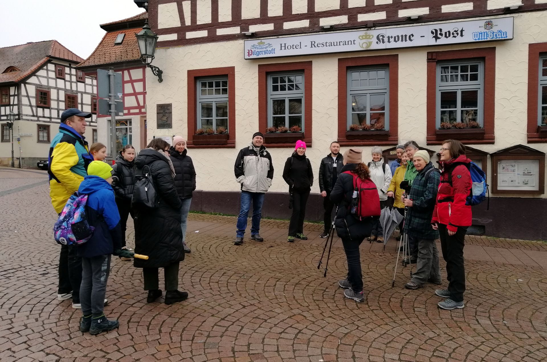 Siebzehn mutige, gut gelaunte Wanderer trafen sich am Sonntagmorgen um 10 Uhr trotz des angekündigten Regens auf dem Marktplatz zur Märzenbecherwanderung über die Nalle ins Gichenbachtal. Darunter neun Wanderer aus der Ukraine. Nach der zweisprachigen Begrüßung durch unsere Wanderführerin Vlada meisterten die elf erfahrenen und sechs neuen Wanderer den Aufstieg über die Wacht zur Ziegelei und von dort auf die große Nalle.