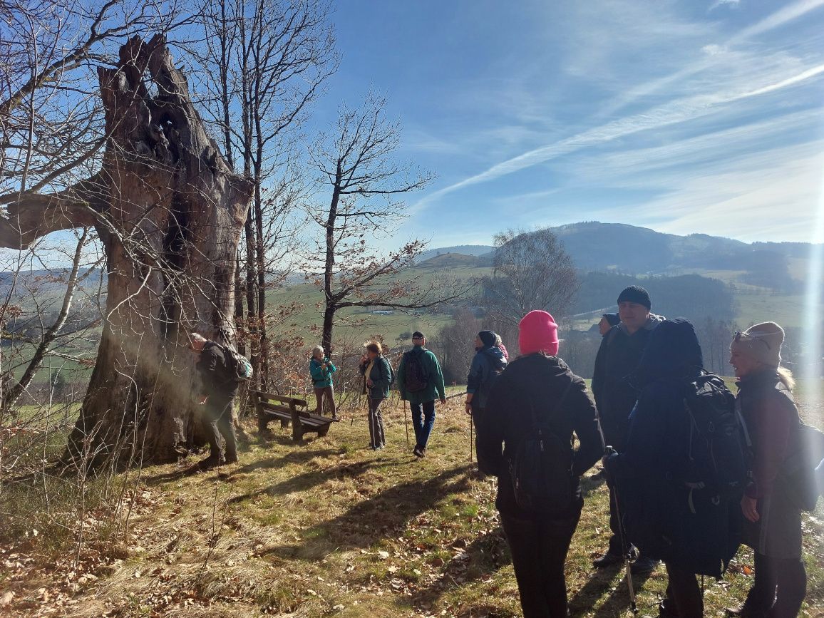 Bei schönstem Sonnenschein, bester 10-13°C Wandertemperatur und guten Gesprächen hatte die Gruppe jedoch zügig den ersten steilen Anstieg über die Wacht in Richtung Ziegelei geschafft und eine erste Trinkpause an der Bank mit dem Rest der alten Eiche eingelegt. Die Meinungen, wie alt der Baum wohl gewesen sei, gingen relativ weit auseinander. Aber dieser Sonntag war voller glücklicher Umstände. Wie aufs Kommando kam unser Naturschutzwart Waldemar Niebling mit seiner Frau um die Ecke spaziert, um uns weiterzuhelfen.