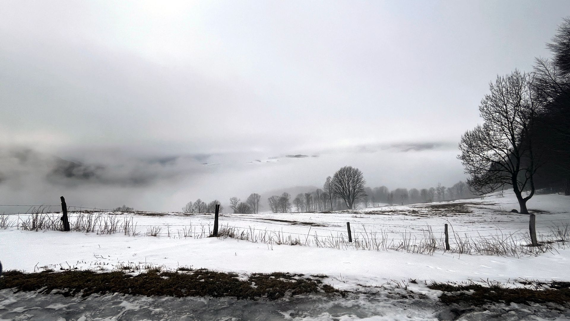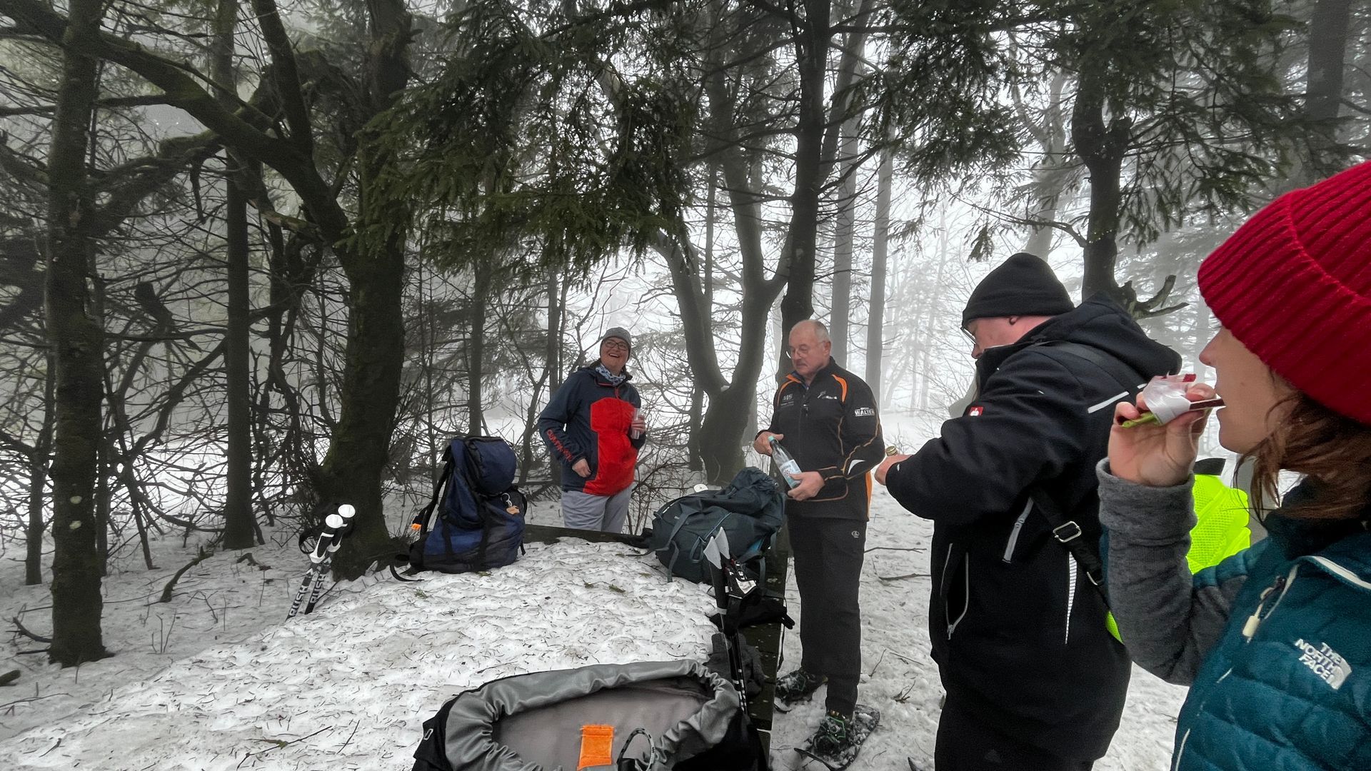 Auf halber Höhe kurz unterhalb des Plateaus lichtete sich für einen kurzen Augenblick der Nebel und wir konnten den Stadtteil Rengersfeld gegenüber schemenhaft erkennen. Doch der Nebel hielt sich oberhalb und lies leider keine einzige Möglichkeit die herrlichen Aussichten ins Fuldatal oder auf die bayerische Seite zu. Den Gästen, die extra aus dem Raum Würzburg zu dieser Wanderung angereist waren, boten wir an, gerne bei schönerem Wetter nochmal zu kommen um die Wanderung – auch ggf. ohne Schneeschuhe – zu gehen.