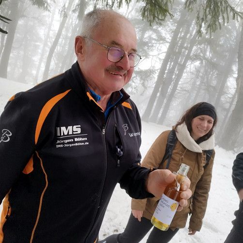 Oben am Gipfel des Simmelsbergs angekommen wartete Waldemar, der über 30 Bienenstöcke als Hobbyimker besitzt, mit einem besonderen Gipfelschnaps auf – selbstgemachter Honig-Propolis-Likör – was für eine schöne Belohnung für alle die mitgekommen sind und dem Nebelwetter getrotzt haben.