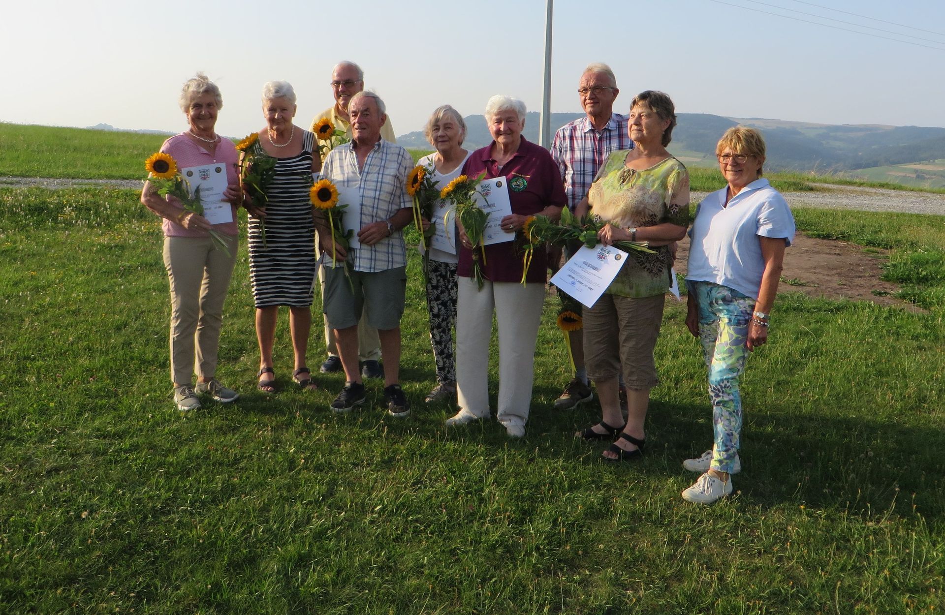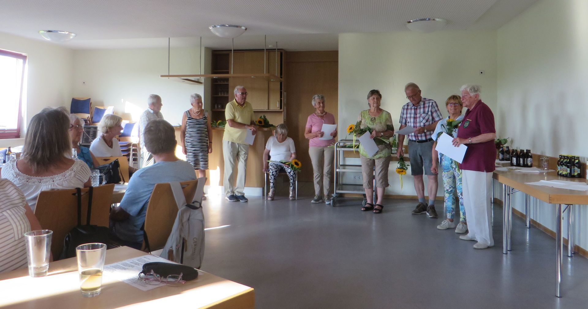 Die Geehrten: Von links: Erika Schleicher 25 Jahre Mitglied, Brigitte Müller 50 Jahre Mitglied, Peter Reuter 40 Jahre Mitglied, Otto Müller 50 Jahre Mitglied, Edeltraud Illichmann 40 Jahre Mitglied, Renate Romeis 70 Jahre Mitglied, Horst und Cornelia Günther beide 50 Jahre Mitglied, Margit Trittin, 1. Vorsitzende
