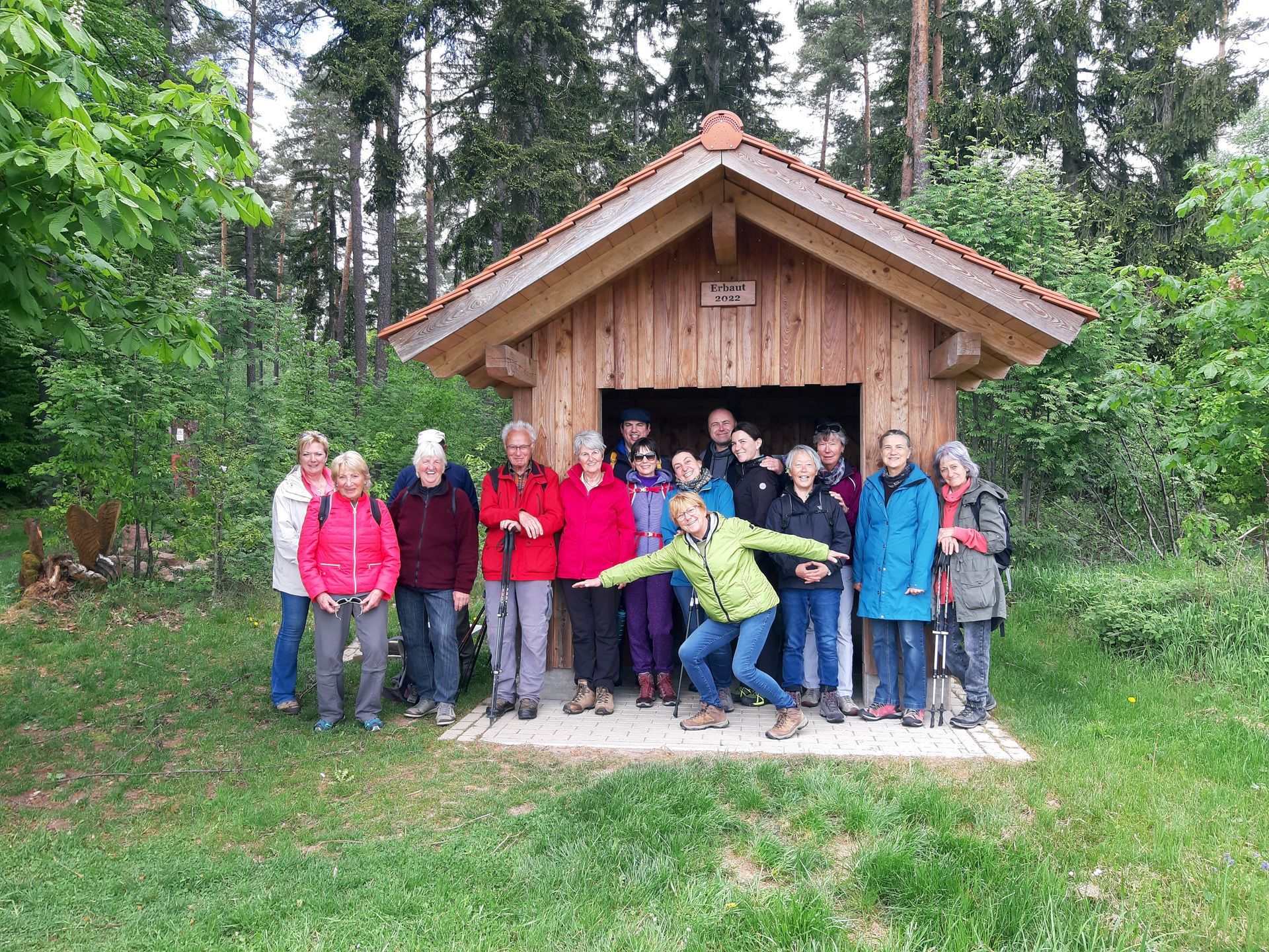 Bei kühlen Temperaturen trafen sich 16 Wanderfreunde um 9.00 Uhr am Marktplatz Gersfeld. In Fahrgemeinschaften fuhren wir nach Waldfenster, einem Ortsteil von Burkhardroth. Durch den Ort, vorbei an einer kleinen Seeanlage, wanderten wir zum Waldrand. An Steinmarkierungen vorbei überquerten wir das sogenannte Königsrondell. Der Weg führte uns entlang von blühenden Wiesen in den Besinnungswald. Der Aufstieg auf die Platzer Kuppe (737 m) forderte uns. Oben angekommen genossen wir die herrliche Aussicht. Nach einer Rast traten wir den Rückweg an. Unterwegs konnten wir uns über die früheren Waldglashütten und deren Relikte informieren. Bei einer Wetterschutzhütte fanden wir einen Erdkühlschrank, den der ein oder andere auch gerne öffnete und ein kühles Bier genoss.