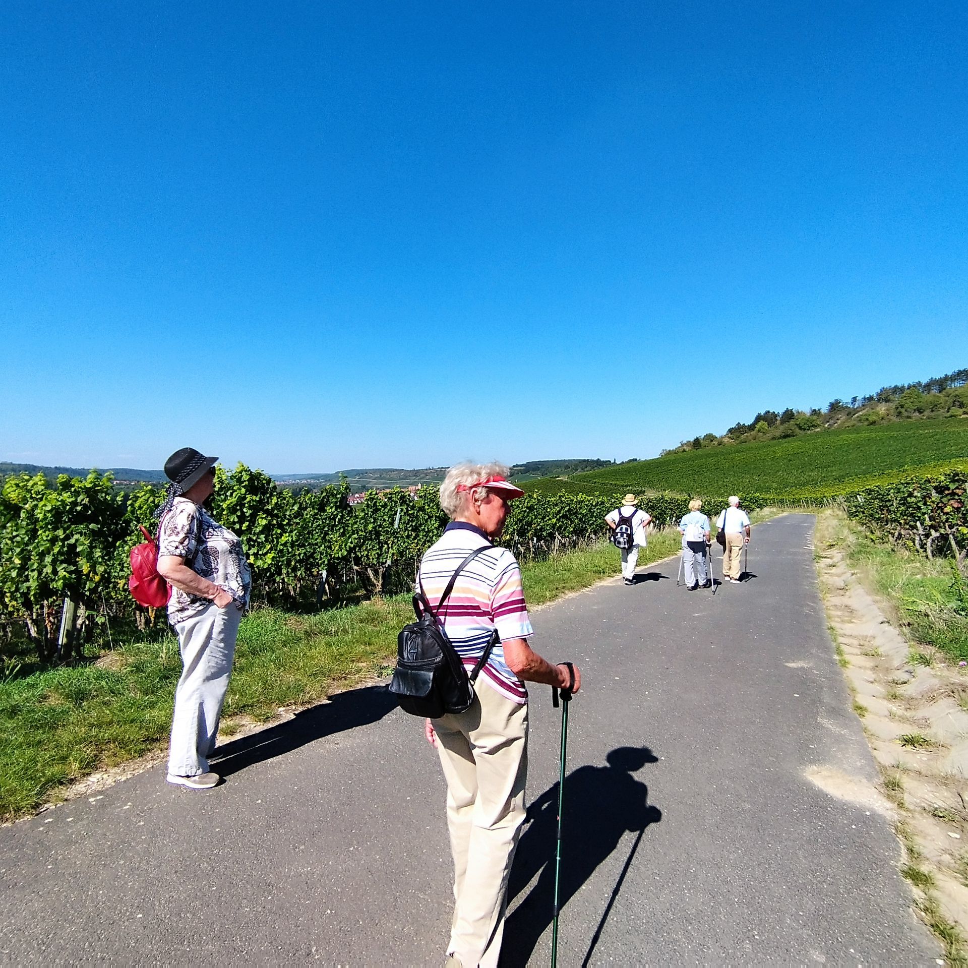 Aufgrund der hohen Temperaturen konnten sich die Teilnehmer entscheiden, ob sie direkt nach Sommerhausen in den Ort, eine kleine Runde durch die Weinberge und dann nach Sommerhausen oder von Kleinochsenfurt über Sommerhausen nach Eibelstadt wandern möchten. Die größere Anzahl entschied sich die Gesamtstecke in „Angriff“ zu nehmen.