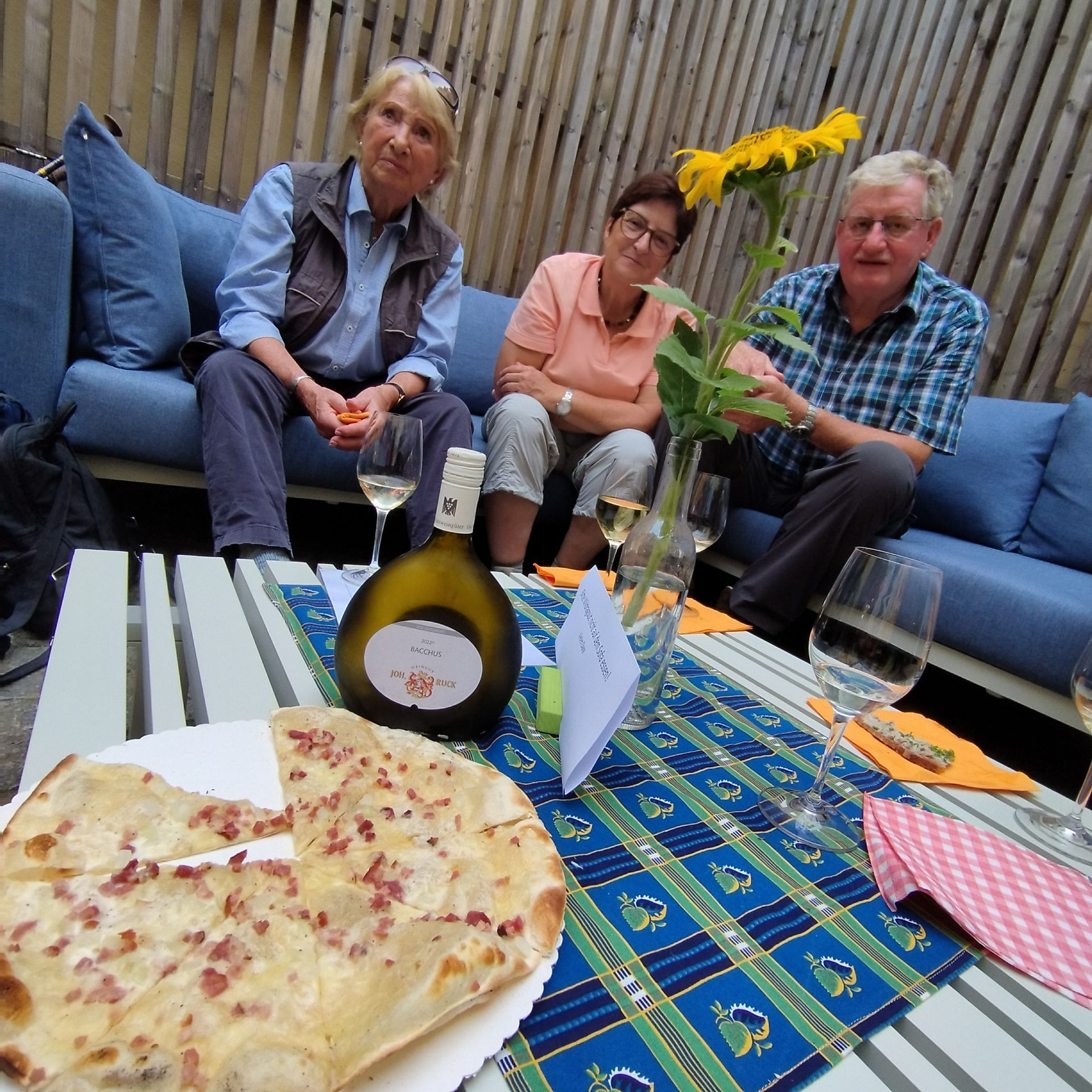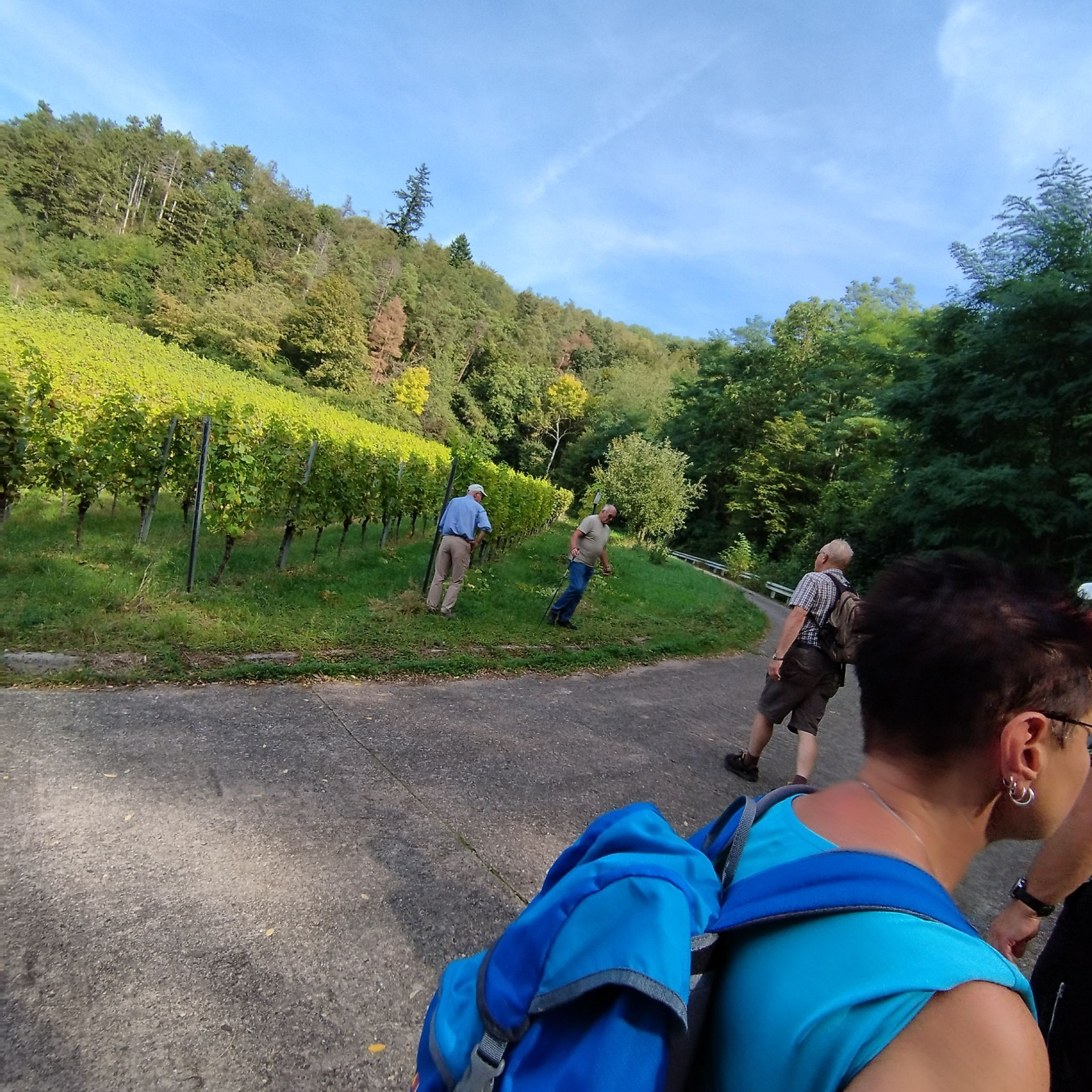 Die Alterspanne der Teilnehmer reichte von über 80-Jährigen zu den beiden jüngsten Teilnehmern Fabian und sein Freund Luis mit 17 Jahren; besonders gefreut haben wir uns über die zweite Teilnahme von Jürgen Gärtner, der mit eigenem PKW nach Rödelsee gefahren und dann mit seinem Segway (barrierefreies Segway) die Tour gefahren ist und uns so an verschiedenen Stellen in den Weinbergen getroffen hatte.