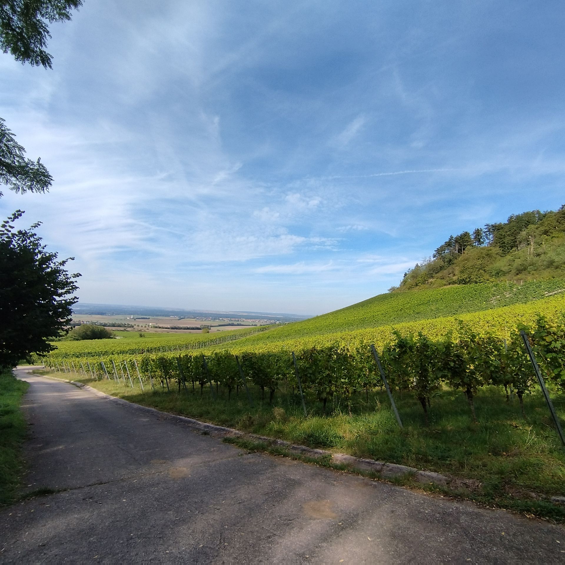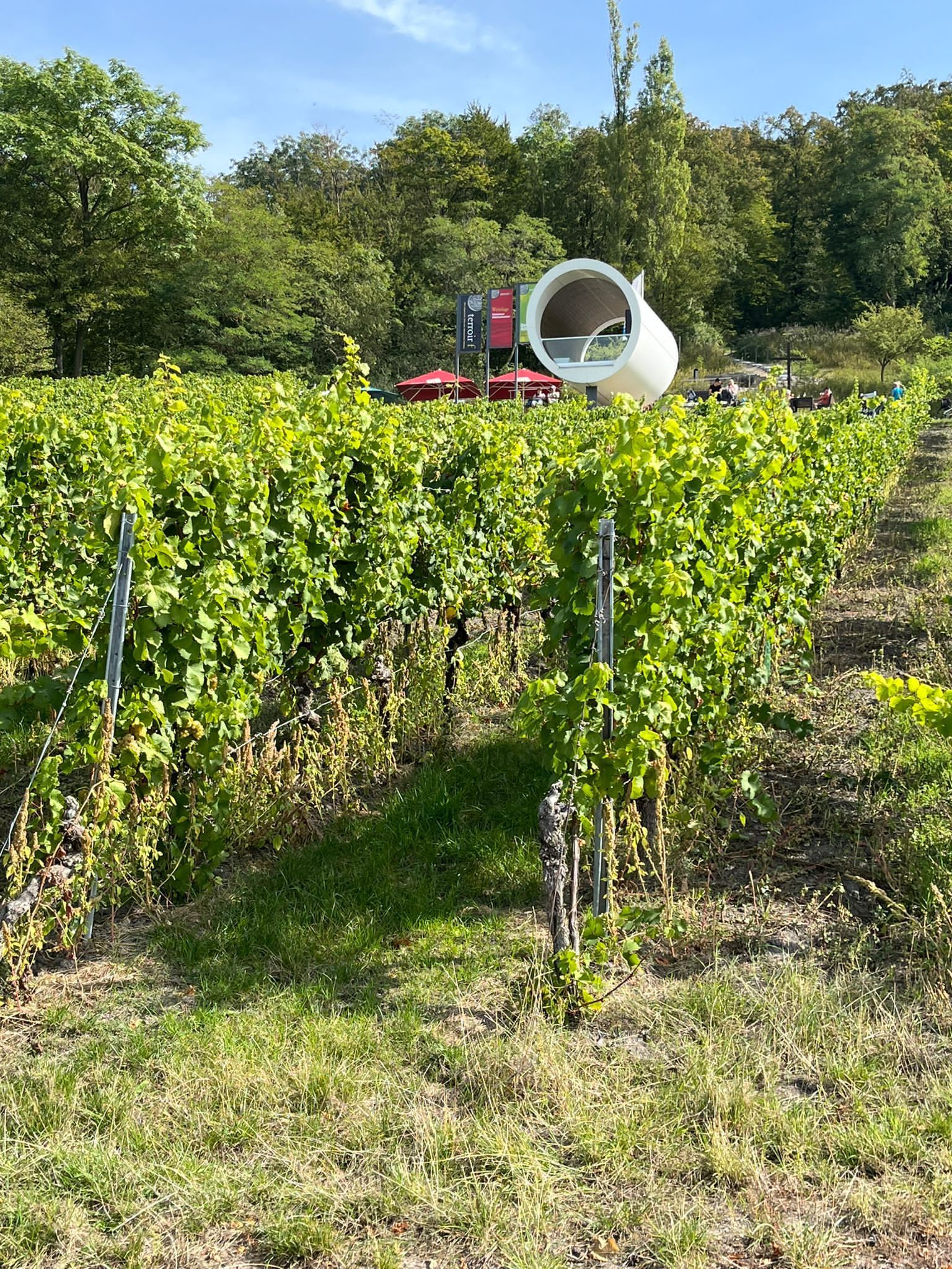 Der Weg durch die Weinberge führte uns mit einem nach ca. 1 km Wegstrecke mit einem kurzen Anstieg zu dem im Jahr 2018 eröffneten neuen Aussichtspunkt „Terrior f – magische Orte des Weinbaus“ mit dem Thema „Silvaner“ oberhalb von Rödelsee. Optisch erinnert dieser Punkt an ein riesiges Fernrohr, durch dieses man auf die Weinlagen und ins weite Land schauen kann. Auch der weitere Weg bescherte uns immer wieder wunderbare Blicke über die Weinreben in die verschiedenen Weinlagen wie Rödelseer Küchenmeister, Schwanberg und dann Julius Echter Berg.