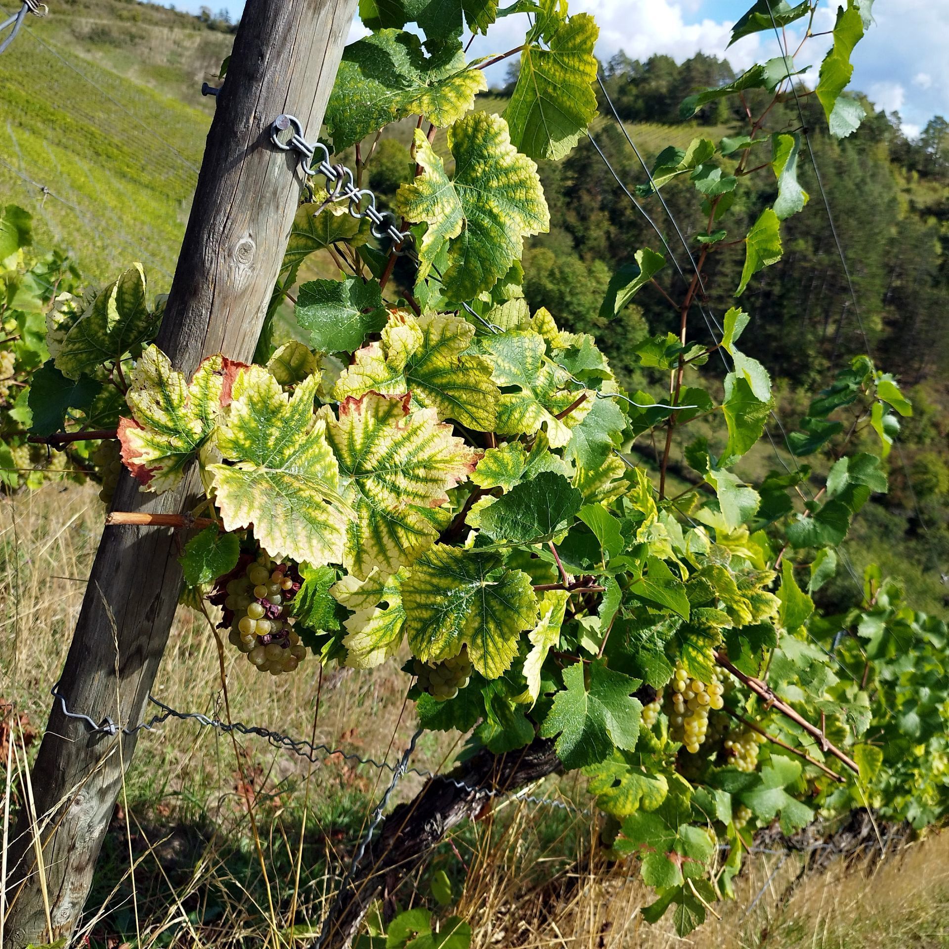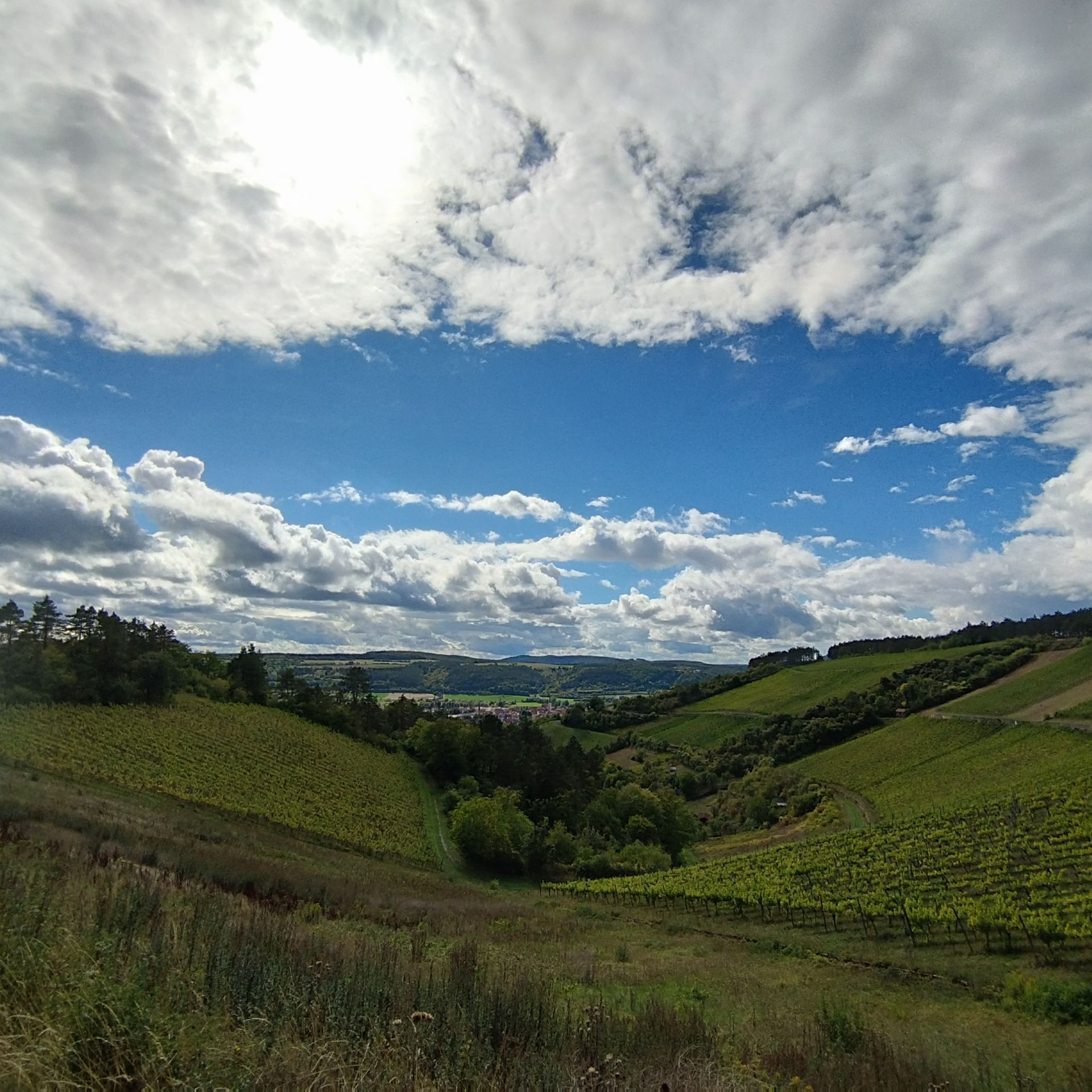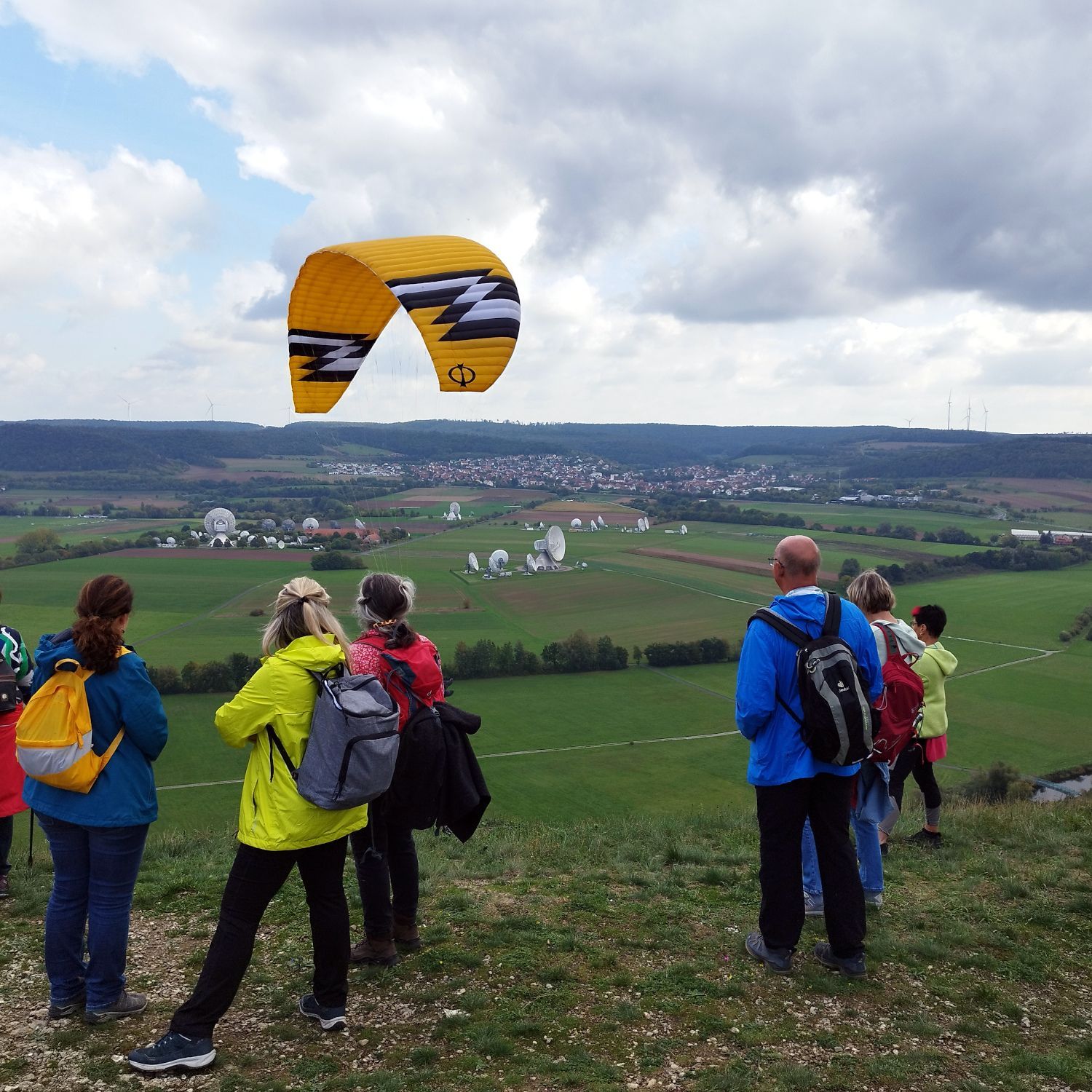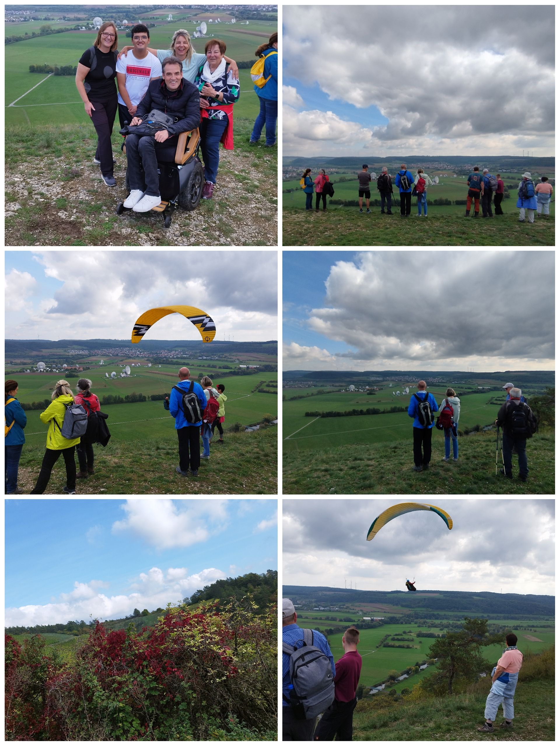 Anschließend starteten wir unsere Wanderung. Zunächst durch den Weinberg; ehe wir am Rand zum Kiefernwald den Startbereich von Paraglidern erreichten. An diesem Platz machten wir eine kurze Pause, genossen den tollen freien Blick auf die fränkische Saale und die mächtige Erdfunkstation unterhalb dieses Platzes. Zu unser aller Freude starteten auch genau zu diesem Zeitpunkt einige Paraglider von diesem Startplatz aus, so dass wir dies aus nächster Nähe beobachten konnten.